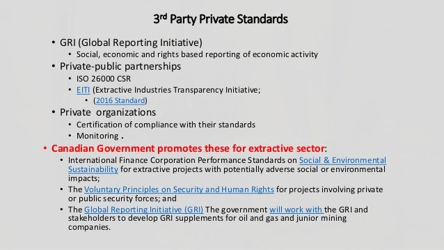 - 11. 3rd Party Private Standards • GRI (Global Reporting Initiative) • Social, economic and rights based reporting of economic activity • Private-public partnerships • ISO 26000 CSR • EITI (Extractive Industries Transparency Initiative; • (2016 Standard) • Private organizations • Certification of compliance with their standards • Monitoring . • Canadian Government promotes these for extractive sector: • International Finance Corporation Performance Standards on Social & Environmental Sustainability for extractive projects with potentially adverse social or environmental impacts; • The Voluntary Principles on Security and Human Rights for projects involving private or public security forces; and • The Global Reporting Initiative (GRI) The government will work with the GRI and stakeholders to develop GRI supplements for oil and gas and junior mining companies.