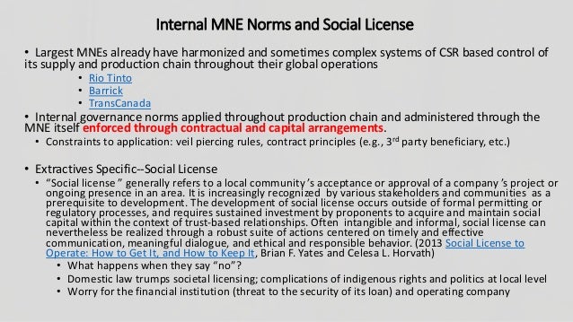 - 13. Internal MNE Norms and Social License • Largest MNEs already have harmonized and sometimes complex systems of CSR based control of its supply and production chain throughout their global operations • Rio Tinto • Barrick • TransCanada • Internal governance norms applied throughout production chain and administered through the MNE itself enforced through contractual and capital arrangements. • Constraints to application: veil piercing rules, contract principles (e.g., 3rd party beneficiary, etc.) • Extractives Specific--Social License • “Social license ” generally refers to a local community ’s acceptance or approval of a company ’s project or ongoing presence in an area. It is increasingly recognized by various stakeholders and communities as a prerequisite to development. The development of social license occurs outside of formal permitting or regulatory processes, and requires sustained investment by proponents to acquire and maintain social capital within the context of trust-based relationships. Often intangible and informal, social license can nevertheless be realized through a robust suite of actions centered on timely and effective communication, meaningful dialogue, and ethical and responsible behavior. (2013 Social License to Operate: How to Get It, and How to Keep It, Brian F. Yates and Celesa L. Horvath) • What happens when they say “no”? • Domestic law trumps societal licensing; complications of indigenous rights and politics at local level • Worry for the financial institution (threat to the security of its loan) and operating company