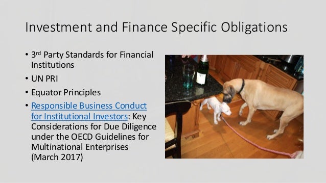 - 14. Investment and Finance Specific Obligations • 3rd Party Standards for Financial Institutions • UN PRI • Equator Principles • Responsible Business Conduct for Institutional Investors: Key Considerations for Due Diligence under the OECD Guidelines for Multinational Enterprises (March 2017)