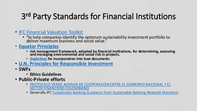 - 15. 3rd Party Standards for Financial Institutions • IFC Financial Valuation Toolkit • “to help companies identify the optimum sustainability investment portfolio to deliver maximum business and social value.” • Equator Principles • risk management framework, adopted by financial institutions, for determining, assessing and managing environmental and social risk in projects. • Guidelines for incorporation into loan documents • U.N. Principles for Responsible Investment • SWFs • Ethics Guidelines • Public-Private efforts • PROTOCOLO VERDE AGENDA DE COOPERACIÓN ENTRE EL GOBIERNO NACIONAL Y EL SECTOR FINANCIERO COLOMBIANO • Generally IFC Sustainable Banking Guidance from Sustainable Banking Network Members
