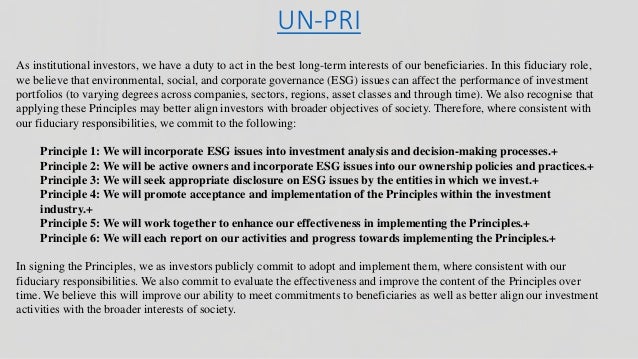 - 16. UN-PRI As institutional investors, we have a duty to act in the best long-term interests of our beneficiaries. In this fiduciary role, we believe that environmental, social, and corporate governance (ESG) issues can affect the performance of investment portfolios (to varying degrees across companies, sectors, regions, asset classes and through time). We also recognise that applying these Principles may better align investors with broader objectives of society. Therefore, where consistent with our fiduciary responsibilities, we commit to the following: Principle 1: We will incorporate ESG issues into investment analysis and decision-making processes.+ Principle 2: We will be active owners and incorporate ESG issues into our ownership policies and practices.+ Principle 3: We will seek appropriate disclosure on ESG issues by the entities in which we invest.+ Principle 4: We will promote acceptance and implementation of the Principles within the investment industry.+ Principle 5: We will work together to enhance our effectiveness in implementing the Principles.+ Principle 6: We will each report on our activities and progress towards implementing the Principles.+ In signing the Principles, we as investors publicly commit to adopt and implement them, where consistent with our fiduciary responsibilities. We also commit to evaluate the effectiveness and improve the content of the Principles over time. We believe this will improve our ability to meet commitments to beneficiaries as well as better align our investment activities with the broader interests of society.