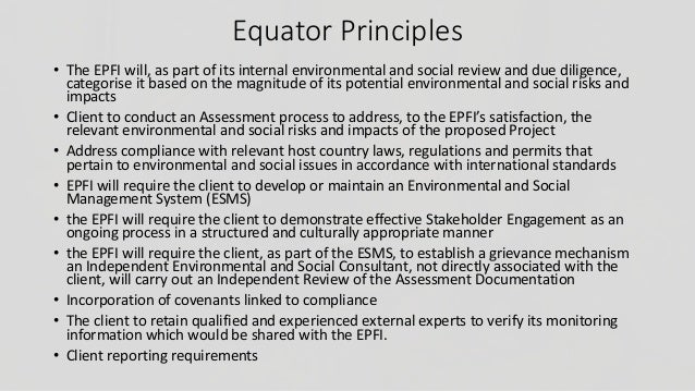 - 17. Equator Principles • The EPFI will, as part of its internal environmental and social review and due diligence, categorise it based on the magnitude of its potential environmental and social risks and impacts • Client to conduct an Assessment process to address, to the EPFI’s satisfaction, the relevant environmental and social risks and impacts of the proposed Project • Address compliance with relevant host country laws, regulations and permits that pertain to environmental and social issues in accordance with international standards • EPFI will require the client to develop or maintain an Environmental and Social Management System (ESMS) • the EPFI will require the client to demonstrate effective Stakeholder Engagement as an ongoing process in a structured and culturally appropriate manner • the EPFI will require the client, as part of the ESMS, to establish a grievance mechanism an Independent Environmental and Social Consultant, not directly associated with the client, will carry out an Independent Review of the Assessment Documentation • Incorporation of covenants linked to compliance • The client to retain qualified and experienced external experts to verify its monitoring information which would be shared with the EPFI. • Client reporting requirements