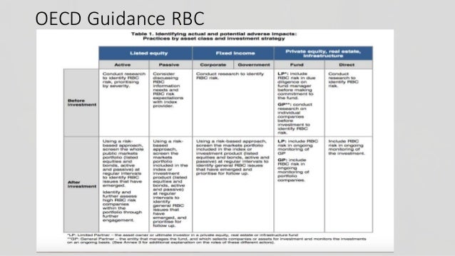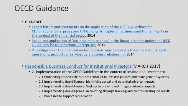 - 18. OECD Guidance • GUIDANCE • Expert letters and statements on the application of the OECD Guidelines for Multinational Enterprises and UN Guiding Principles on Business and Human Rights in the context of the financial sector, 2014 • Scope and application of ‘business relationships’ in the financial sector under the OECD Guidelines for Multinational Enterprises, 2014 • Due diligence in the financial sector: adverse impacts directly linked to financial sector operations, products or services by a business relationship, 2014 • Responsible Business Conduct for Institutional Investors (MARCH 2017) • 2. Implementation of the OECD Guidelines in the context of institutional investment • 2.1 Embedding responsible business conduct in investor policies and management systems • 2.2 Implementing due diligence: Identifying actual and potential adverse impacts • 2.3 Implementing due diligence: Seeking to prevent and mitigate adverse impacts • 2.4 Implementing due diligence: Accounting through tracking and communicating on results • 2.5 Processes to support remediation