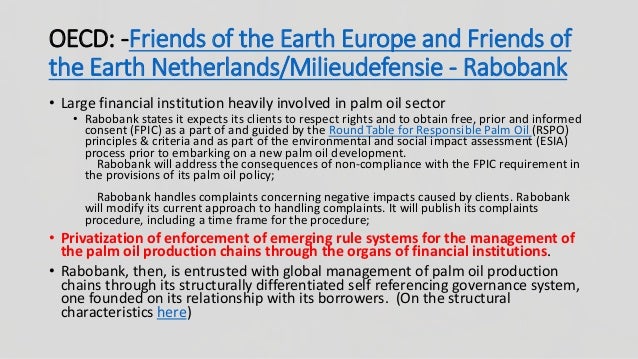 - 21. OECD: -Friends of the Earth Europe and Friends of the Earth Netherlands/Milieudefensie - Rabobank • Large financial institution heavily involved in palm oil sector • Rabobank states it expects its clients to respect rights and to obtain free, prior and informed consent (FPIC) as a part of and guided by the Round Table for Responsible Palm Oil (RSPO) principles & criteria and as part of the environmental and social impact assessment (ESIA) process prior to embarking on a new palm oil development. Rabobank will address the consequences of non-compliance with the FPIC requirement in the provisions of its palm oil policy; Rabobank handles complaints concerning negative impacts caused by clients. Rabobank will modify its current approach to handling complaints. It will publish its complaints procedure, including a time frame for the procedure; • Privatization of enforcement of emerging rule systems for the management of the palm oil production chains through the organs of financial institutions. • Rabobank, then, is entrusted with global management of palm oil production chains through its structurally differentiated self referencing governance system, one founded on its relationship with its borrowers. (On the structural characteristics here)