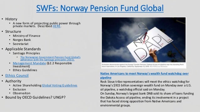 - 22. SWFs: Norway Pension Fund Global • History • A new form of projecting public power through private markets. Described HERE. • Structure • Ministry of Finance • Norges Bank • Secretariat • Applicable Standards • Santiago Principles • The Norwegian Government Pension Fund Global’s adherence with the Santiago principles 2015). • Management Mandate (§2.2 Responsible Investment) • Ethics Guidelines • Ethics Council • Authority • Active Shareholding Global Voting Guidelines • Exclusion • Observaiton • Bound by OECD Guidelines? UNGP? Native Americans to meet Norway's wealth fund watchdog over pipeline Rock Sioux tribe representatives will meet the ethics watchdog for Norway's $915 billion sovereign wealth fund on Monday over a U.S. oil pipeline, a watchdog official said on Monday. On Sunday, Norway's largest bank DNB sold its share of loans funding the Dakota Access oil pipeline, ending its involvement in a project that has faced strong opposition from Native Americans and environmental groups.