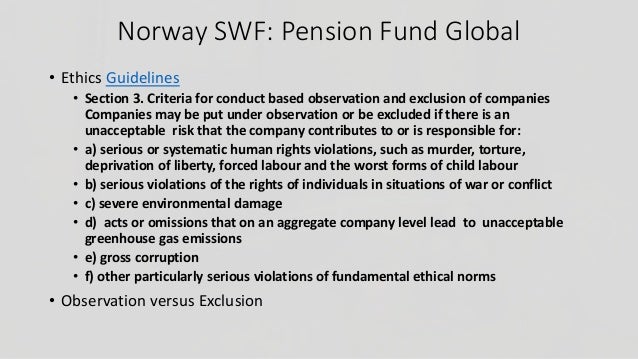 - 23. Norway SWF: Pension Fund Global • Ethics Guidelines • Section 3. Criteria for conduct based observation and exclusion of companies Companies may be put under observation or be excluded if there is an unacceptable risk that the company contributes to or is responsible for: • a) serious or systematic human rights violations, such as murder, torture, deprivation of liberty, forced labour and the worst forms of child labour • b) serious violations of the rights of individuals in situations of war or conflict • c) severe environmental damage • d) acts or omissions that on an aggregate company level lead to unacceptable greenhouse gas emissions • e) gross corruption • f) other particularly serious violations of fundamental ethical norms • Observation versus Exclusion
