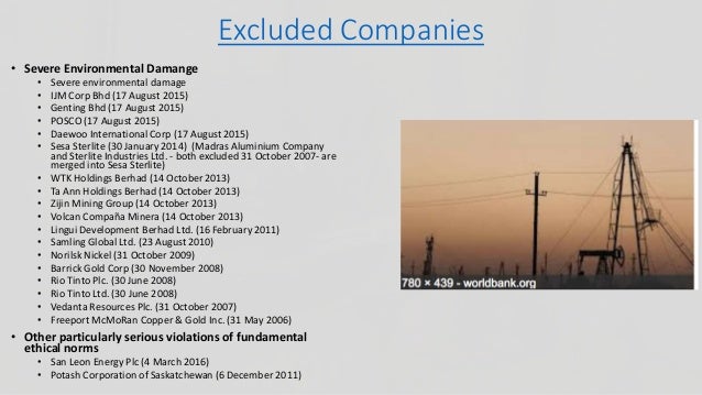 - 24. Excluded Companies • Severe Environmental Damange • Severe environmental damage • IJM Corp Bhd (17 August 2015) • Genting Bhd (17 August 2015) • POSCO (17 August 2015) • Daewoo International Corp (17 August 2015) • Sesa Sterlite (30 January 2014) (Madras Aluminium Company and Sterlite Industries Ltd. - both excluded 31 October 2007- are merged into Sesa Sterlite) • WTK Holdings Berhad (14 October 2013) • Ta Ann Holdings Berhad (14 October 2013) • Zijin Mining Group (14 October 2013) • Volcan Compaña Minera (14 October 2013) • Lingui Development Berhad Ltd. (16 February 2011) • Samling Global Ltd. (23 August 2010) • Norilsk Nickel (31 October 2009) • Barrick Gold Corp (30 November 2008) • Rio Tinto Plc. (30 June 2008) • Rio Tinto Ltd. (30 June 2008) • Vedanta Resources Plc. (31 October 2007) • Freeport McMoRan Copper & Gold Inc. (31 May 2006) • Other particularly serious violations of fundamental ethical norms • San Leon Energy Plc (4 March 2016) • Potash Corporation of Saskatchewan (6 December 2011)