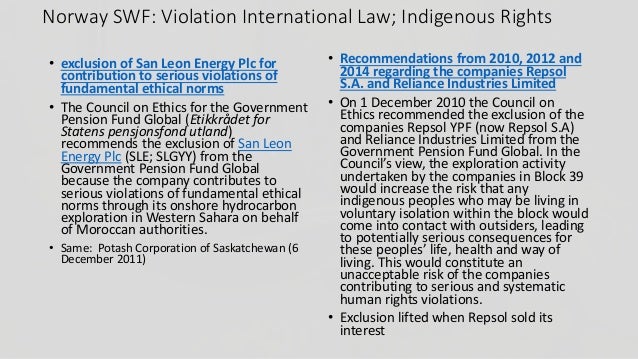 - 25. Norway SWF: Violation International Law; Indigenous Rights • exclusion of San Leon Energy Plc for contribution to serious violations of fundamental ethical norms • The Council on Ethics for the Government Pension Fund Global (Etikkrådet for Statens pensjonsfond utland) recommends the exclusion of San Leon Energy Plc (SLE; SLGYY) from the Government Pension Fund Global because the company contributes to serious violations of fundamental ethical norms through its onshore hydrocarbon exploration in Western Sahara on behalf of Moroccan authorities. • Same: Potash Corporation of Saskatchewan (6 December 2011) • Recommendations from 2010, 2012 and 2014 regarding the companies Repsol S.A. and Reliance Industries Limited • On 1 December 2010 the Council on Ethics recommended the exclusion of the companies Repsol YPF (now Repsol S.A) and Reliance Industries Limited from the Government Pension Fund Global. In the Council’s view, the exploration activity undertaken by the companies in Block 39 would increase the risk that any indigenous peoples who may be living in voluntary isolation within the block would come into contact with outsiders, leading to potentially serious consequences for these peoples’ life, health and way of living. This would constitute an unacceptable risk of the companies contributing to serious and systematic human rights violations. • Exclusion lifted when Repsol sold its interest
