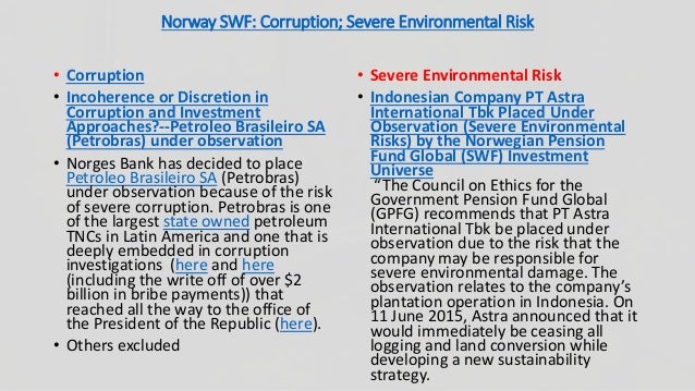 - 26. Norway SWF: Corruption; Severe Environmental Risk • Corruption • Incoherence or Discretion in Corruption and Investment Approaches?--Petroleo Brasileiro SA (Petrobras) under observation • Norges Bank has decided to place Petroleo Brasileiro SA (Petrobras) under observation because of the risk of severe corruption. Petrobras is one of the largest state owned petroleum TNCs in Latin America and one that is deeply embedded in corruption investigations (here and here (including the write off of over $2 billion in bribe payments)) that reached all the way to the office of the President of the Republic (here). • Others excluded • Severe Environmental Risk • Indonesian Company PT Astra International Tbk Placed Under Observation (Severe Environmental Risks) by the Norwegian Pension Fund Global (SWF) Investment Universe “The Council on Ethics for the Government Pension Fund Global (GPFG) recommends that PT Astra International Tbk be placed under observation due to the risk that the company may be responsible for severe environmental damage. The observation relates to the company’s plantation operation in Indonesia. On 11 June 2015, Astra announced that it would immediately be ceasing all logging and land conversion while developing a new sustainability strategy.