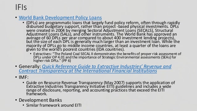 - 28. IFIs • World Bank Development Policy Loans • (DPLs) are programmatic loans that largely fund policy reform, often through rapidly disbursed budgetary support, rather than project -based physical investments. DPLs were created in 2004 by merging Sectoral Adjustment Loans (SECALS), Structural Adjustment Loans (SALs), and other instruments. The World Bank has approved an average of 60 DPLs per year compared to about 400 investment lending projects), but the size of each DPL is generally much larger than an investment loan. While the majority of DPLs go to middle income countries, at least a quarter of the loans are given to the world’s poorest countries (IDA countries). • Extractives: “The Poland Coal SECAL II demonstrates the benefits of proper risk assessment of DPLs under OP 4.01 and the importance of Strategic Environmental assessments (SEAs) for higher risk DPLs.” (PP 6) • Generally: Quick Reference Guide to Extractive Industries’ Revenue and Contract Transparency at the International Financial Institutions • IMF: • Guide on Resource Revenue Transparency (May 2007) supports the application of Extractive Industries Transparency Initiative EITI) guidelines and includes a wide range of disclosure, reporting, and accounting practices that exceed the EITI framework. • Development Banks • Similar framework around EITI