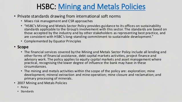 - 29. HSBC: Mining and Metals Policies • Private standards drawing from international soft norms • Mixes risk management and CSR approaches • “HSBC’s Mining and Metals Sector Policy provides guidance to its offices on sustainability standards applicable to the Group’s involvement with this sector. The standards are based on those accepted by the industry and by other stakeholders as representing best practice, and are consistent with HSBC’s long-standing commitment to sustainable development.” • Complemented by Equator Principles • Scope • The financial services covered by the Mining and Metals Sector Policy include all lending and other forms of financial assistance, debt capital markets activities, project finance and advisory work. The policy applies to equity capital markets and asset management where practical, recognising the lower degree of influence the bank may have in these circumstances. • The mining and metals activities within the scope of the policy are: exploration; mine development; mineral extraction and mine operation; mine closure and reclamation; and primary processing of minerals. • 2007 Mining and Metals Policies • Policy • Standards