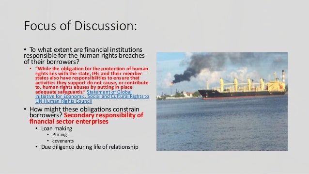 - 3. Focus of Discussion: • To what extent are financial institutions responsible for the human rights breaches of their borrowers? • “While the obligation for the protection of human rights lies with the state, IFIs and their member states also have responsibilities to ensure that activities they support do not cause, or contribute to, human rights abuses by putting in place adequate safeguards.” Statement of Global Initiative for Economic, Social and Cultural Rights to UN Human Rights Council • How might these obligations constrain borrowers? Secondary responsibility of financial sector enterprises • Loan making • Pricing • covenants • Due diligence during life of relationship