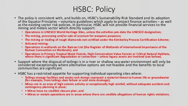 - 30. HSBC: Policy • The policy is consistent with, and builds on, HSBC’s Sustainability Risk Standard and its adoption of the Equator Principles – voluntary guidelines which apply to project finance activities – as well as the existing sector risk policies. In particular, HSBC will not provide financial services to the mining and metals sector which directly support: • Operations in UNESCO World Heritage Sites, unless the activities pre-date the UNESCO designation; • The mining, processing and/or sale of uranium for weapons purposes; • The mining or trading of rough diamonds not certified under the Kimberley Process Certification Scheme; • Artisanal mining; • Operations in wetlands on the Ramsar List (the Register of Wetlands of International Importance of the Ramsar Convention on Wetlands); and • Operations in Primary Tropical Moist Forests, High Conservation Value Forests or Critical Natural Habitats, where there is significant degradation or conversion – unless legacy assets are involved (see below). • Support where the disposal of tailings is in a river or shallow sea-water environment will only be considered exceptionally where alternative options are not feasible and the benefits to local communities are significant. • HSBC has a restricted appetite for supporting individual operating sites where: • Tailings storage facilities and waste rock dumps represent a material threat to human life or groundwater (for example, from tailings dam failure or acid mine drainage); • Mines are in an area of high seismic activity or exceptionally high rainfall, without adequate accident and contingency planning in place; • • Mines have no credible closure plan; and • • Mines or metals operations are in areas where there are credible allegations of human rights violations.