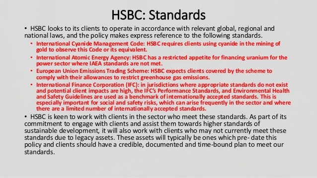 - 31. HSBC: Standards • HSBC looks to its clients to operate in accordance with relevant global, regional and national laws, and the policy makes express reference to the following standards. • International Cyanide Management Code: HSBC requires clients using cyanide in the mining of gold to observe this Code or its equivalent. • International Atomic Energy Agency: HSBC has a restricted appetite for financing uranium for the power sector where IAEA standards are not met. • European Union Emissions Trading Scheme: HSBC expects clients covered by the scheme to comply with their allowances to restrict greenhouse gas emissions. • International Finance Corporation (IFC): in jurisdictions where appropriate standards do not exist and potential client impacts are high, the IFC’s Performance Standards, and Environmental Health and Safety Guidelines are used as a benchmark of internationally accepted standards. This is especially important for social and safety risks, which can arise frequently in the sector and where there are a limited number of internationally accepted standards. • HSBC is keen to work with clients in the sector who meet these standards. As part of its commitment to engage with clients and assist them towards higher standards of sustainable development, it will also work with clients who may not currently meet these standards due to legacy assets. These assets will typically be ones which pre- date this policy and clients should have a credible, documented and time-bound plan to meet our standards.
