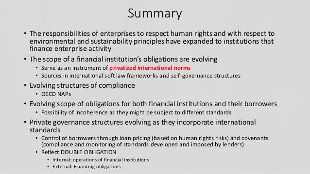 - 33. Summary • The responsibilities of enterprises to respect human rights and with respect to environmental and sustainability principles have expanded to institutions that finance enterprise activity • The scope of a financial institution’s obligations are evolving • Serve as an instrument of privatized international norms • Sources in international soft law frameworks and self-governance structures • Evolving structures of compliance • OECD NAPs • Evolving scope of obligations for both financial institutions and their borrowers • Possibility of incoherence as they might be subject to different standards • Private governance structures evolving as they incorporate international standards • Control of borrowers through loan pricing (based on human rights risks) and covenants (compliance and monitoring of standards developed and imposed by lenders) • Reflect DOUBLE OBLIGATION • Internal: operations of financial institutions • External: Financing obligations