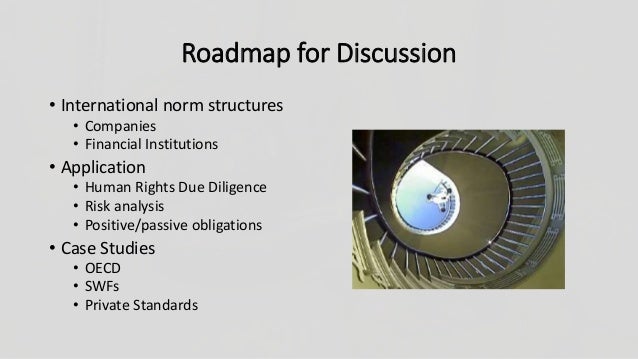 - 4. Roadmap for Discussion • International norm structures • Companies • Financial Institutions • Application • Human Rights Due Diligence • Risk analysis • Positive/passive obligations • Case Studies • OECD • SWFs • Private Standards