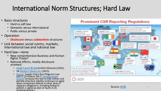 - 5. International Norm Structures; Hard Law • Basic structures • Hard vs soft law • Domestic versus international • Public versus private • Operation • Disclosure versus substantive structures • Link between social norms, markets, international law and national law • Hard law—none • New comprehensive Business and Human Rights Treaty? • National efforts, mostly disclosure oriented • Dodd Franck ¶1502Conflict Minerals (2010); • UK Modern Slavery Act (2015) • France: Supply Chain Due Diligence Law (2017) [24 March 2017: Constitutional Council removed the €10 to €30 million civil penalty attached, liability continues to apply when companies default on their duty of vigilance obligations, including failing to publish a vigilance plan or faults in its implementation.] 5Source HERE
