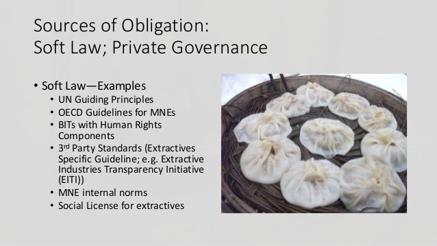 - 7. Sources of Obligation: Soft Law; Private Governance • Soft Law—Examples • UN Guiding Principles • OECD Guidelines for MNEs • BITs with Human Rights Components • 3rd Party Standards (Extractives Specific Guideline; e.g. Extractive Industries Transparency Initiative (EITI)) • MNE internal norms • Social License for extractives