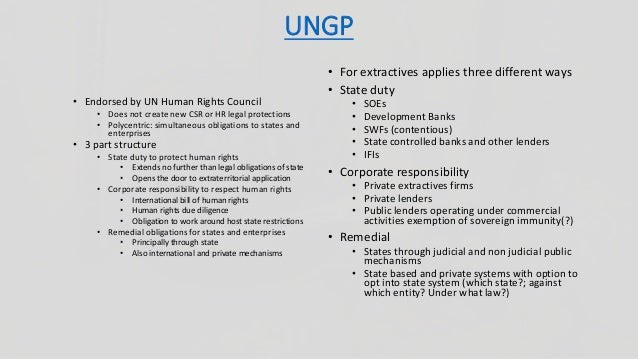 - 8. UNGP • Endorsed by UN Human Rights Council • Does not create new CSR or HR legal protections • Polycentric: simultaneous obligations to states and enterprises • 3 part structure • State duty to protect human rights • Extends no further than legal obligations of state • Opens the door to extraterritorial application • Corporate responsibility to respect human rights • International bill of human rights • Human rights due diligence • Obligation to work around host state restrictions • Remedial obligations for states and enterprises • Principally through state • Also international and private mechanisms • For extractives applies three different ways • State duty • SOEs • Development Banks • SWFs (contentious) • State controlled banks and other lenders • IFIs • Corporate responsibility • Private extractives firms • Private lenders • Public lenders operating under commercial activities exemption of sovereign immunity(?) • Remedial • States through judicial and non judicial public mechanisms • State based and private systems with option to opt into state system (which state?; against which entity? Under what law?)