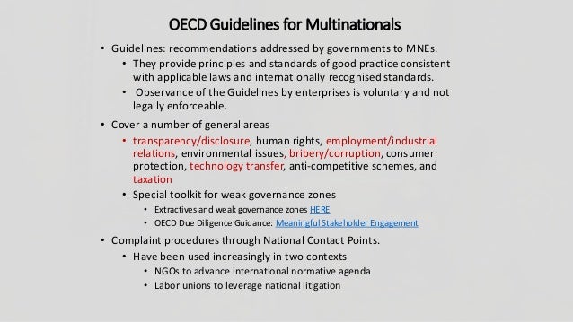 - 9. OECD Guidelines for Multinationals • Guidelines: recommendations addressed by governments to MNEs. • They provide principles and standards of good practice consistent with applicable laws and internationally recognised standards. • Observance of the Guidelines by enterprises is voluntary and not legally enforceable. • Cover a number of general areas • transparency/disclosure, human rights, employment/industrial relations, environmental issues, bribery/corruption, consumer protection, technology transfer, anti-competitive schemes, and taxation • Special toolkit for weak governance zones • Extractives and weak governance zones HERE • OECD Due Diligence Guidance: Meaningful Stakeholder Engagement • Complaint procedures through National Contact Points. • Have been used increasingly in two contexts • NGOs to advance international normative agenda • Labor unions to leverage national litigation
